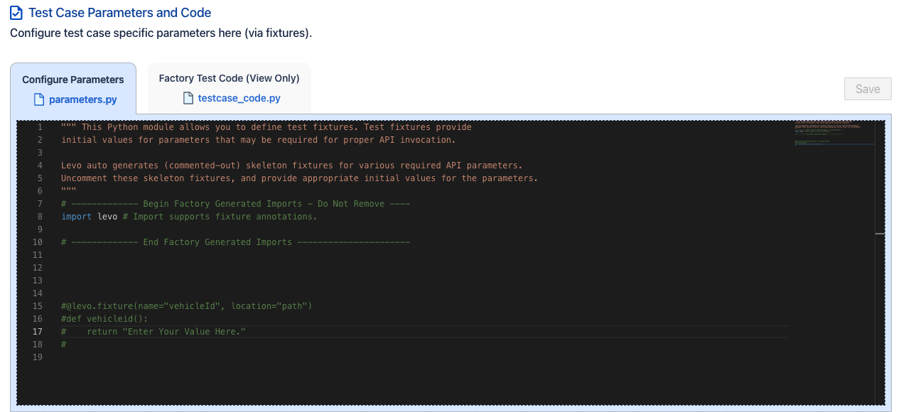 Levo autogenerates fixtures for these required API parameters. These autogenerated fixtures are located in the parameters.py code block of the test case (see below).